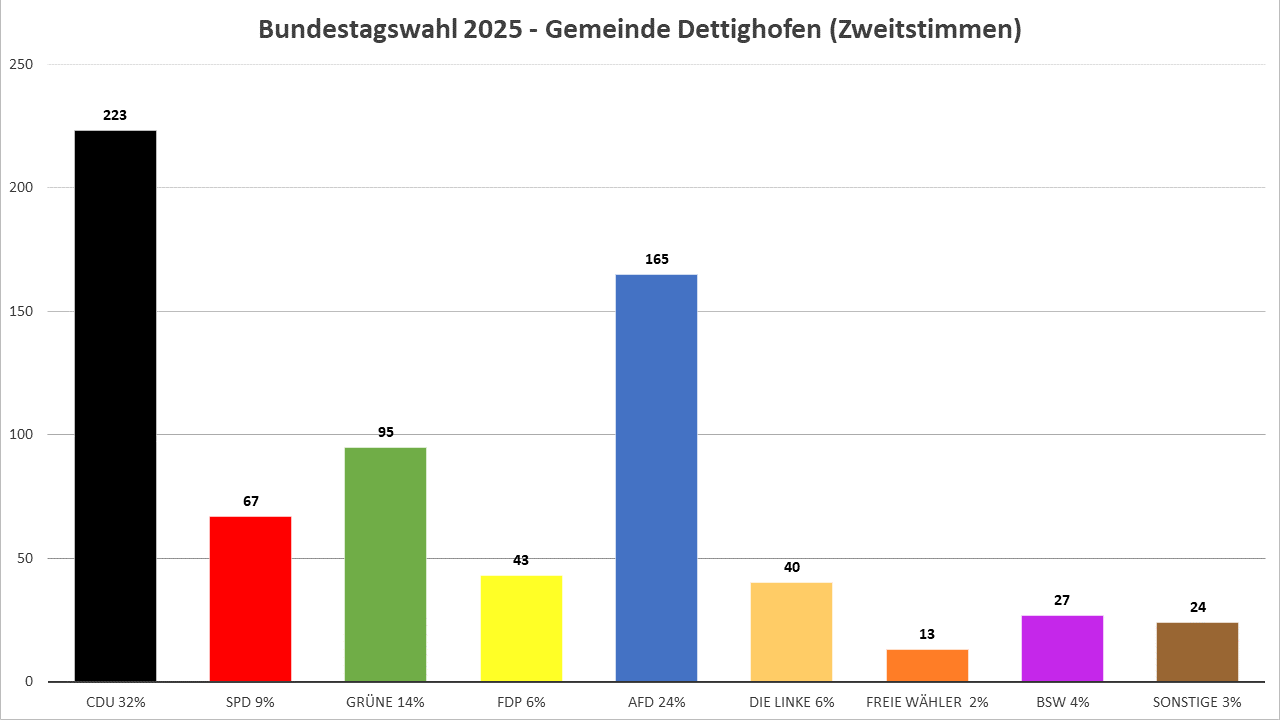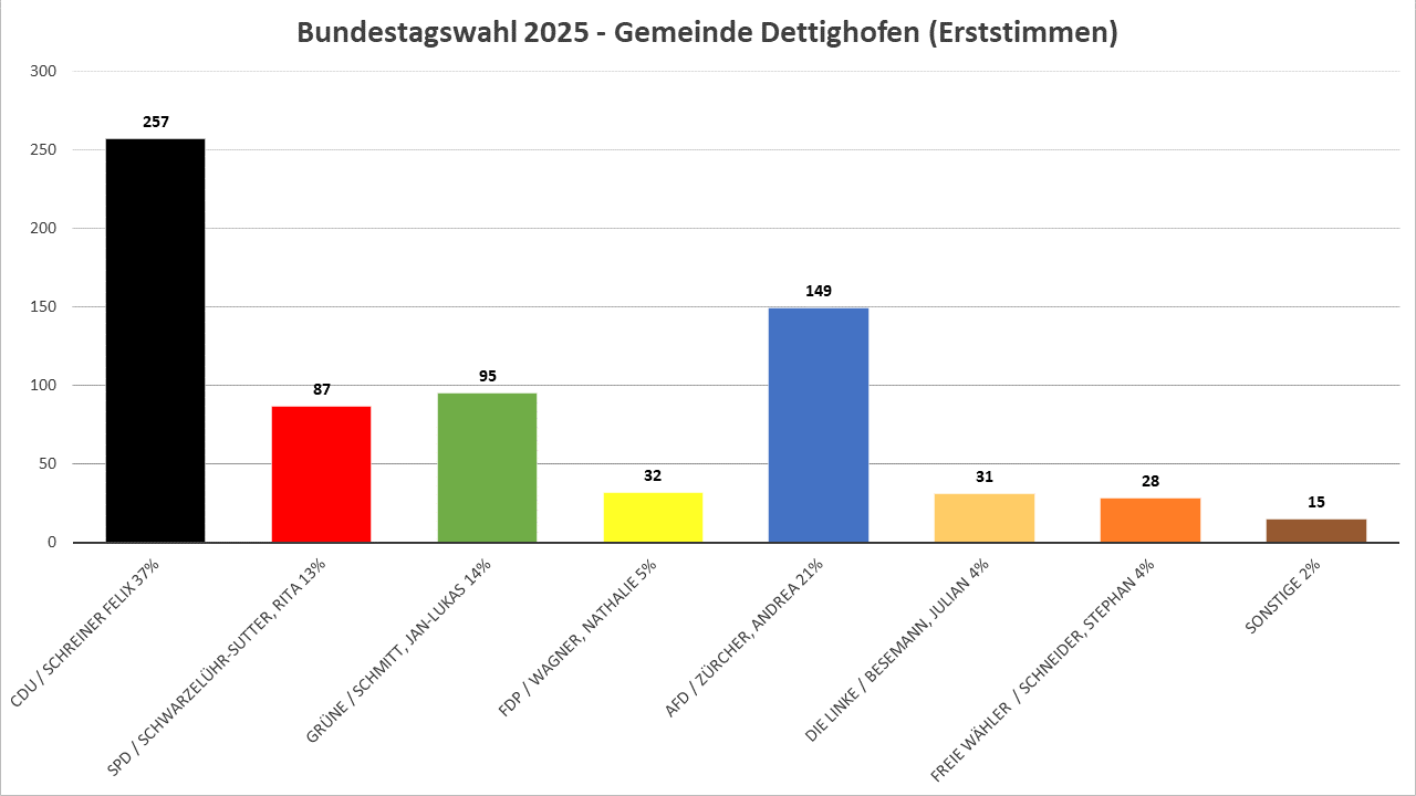 Bundestagswahl 23. Februar 2025 - Ergebnisse in Dettighofen Von 843 Wahlberechtigten haben 702 ihre Stimme abgegeben, dies entspricht einer Wahlbeteiligung von 83,27%.
